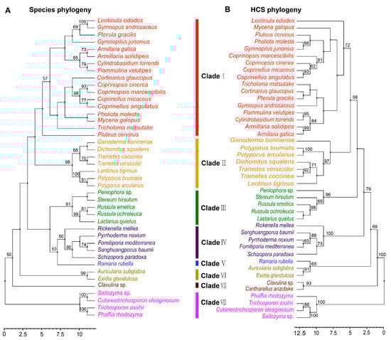 Phylogenetic relationship of both species and HCS homologous sequences in Agaricomycetes. (A) Maximum likelihood tree showing the relationships among different orders of Agaricomycetes based on LSU, SSU, RPB1, RPB2, ITS (5.8S), and EF1-α genes with species in Tremellomycetes as the outgroup. (B) Maximum likelihood tree showing the relationships among different orders of Agaricomycetes based on HCS amino acid sequences with species in Tremellomycetes as the outgroup. MP bootstrap values (≥50%) of each clade are indicated at nodes. Scale bar in the upper left indicates substitutions per site. (Clade I: Agaricales, Clade II: Polyporales, Clade III: Russulales, Clade IV: Hymenochaetales, Clade V: Gomphales, Clade VI: Auriculariales, Clade VII: Cantharellals, and Clade VIII: Tremellomycetes).