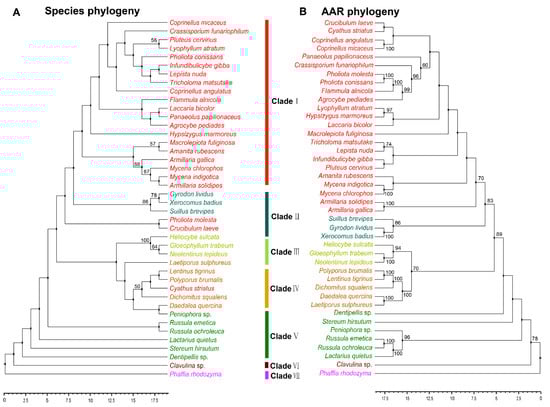 Phylogenetic relationship both species and AAR homologous sequences in Agaricomycetes. (A) Maximum likelihood tree showing the relationships among different orders of Agaricomycetes based on LSU, SSU, RPB1, RPB2, ITS (5.8 S), and EF1-α genes with species in Tremellomycetes as the outgroup. (B) Maximum likelihood tree showing the relationships among different orders of Agaricomycetes based on AAR amino acid sequence with species in Tremellomycetes as outgroup. MP bootstrap values (≥50%) of each clade are indicated at nodes. Scale bar in the upper left indicates substitutions per site (Clade I: Agaricales, Clade II: Boletales, Clade III: Gloeophyllales, Clade IV: Polyporales, Clade V: Russulales, Clade VI: Cantharellals, and Clade VII: Tremellomycetes).