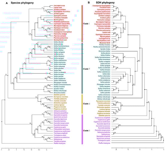 Phylogenetic relationship both species and SDH homologous sequences in Agaricomycetes. (A) Maximum likelihood tree showing the relationships among different orders of Agaricomycetes based on LSU, SSU, RPB1, RPB2, ITS (5.8 S), and EF1-α genes with species in Tremellomycetes as the outgroup. (B) Maximum likelihood tree showing the relationships among different orders of Agaricomycetes based on SDH amino acid sequence with species in Tremellomycetes as the outgroup. MP bootstrap values (≥50%) of each clade are indicated at nodes. Scale bar in the upper left indicates substitutions per site (Clade I: Agaricales, Clade II: Boletales, Clade III: Polyporales, and Clade IV: Tremellomycetes).