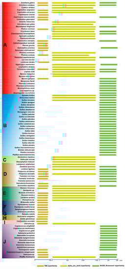 Conserved domains in the primary structures of HCS, AAR, and SDH in Agaricomycetes. (A) Agaricales, (B) Boletales, (C) Gloeophyllales, (D) Polyporales, (E) Russulales, (F) Hymenochaetales, (G) Gomphales, (H) Auriculariales, (I) Cantharellals, and (J) Tremellomycetes. Abbreviations: “TIM superfamily”: These members share a conserved triose-phosphate isomerase (TIM) barrel domain consisting of a core beta(8)-alpha (8) motif with the eight parallel beta strands forming an enclosed barrel surrounded by eight alpha helices. The domain has a catalytic center containing a divalent cation-binding site formed by a cluster of invariant residues that cap the core of the barrel; “alpha_am_amid superfamily”: Members of this protein family are L-aminoadipate-semialdehyde dehydrogenase (EC 1.2.1.31). It is also called alpha-aminoadipate reductase. Lysine is synthesized via aminoadipate in higher fungi; “NADB Rossmann superfamily”: Lysine-ketoglutarate reductase/saccharopine dehydrogenase. “﹏”: It represents at least 331 amino acids.