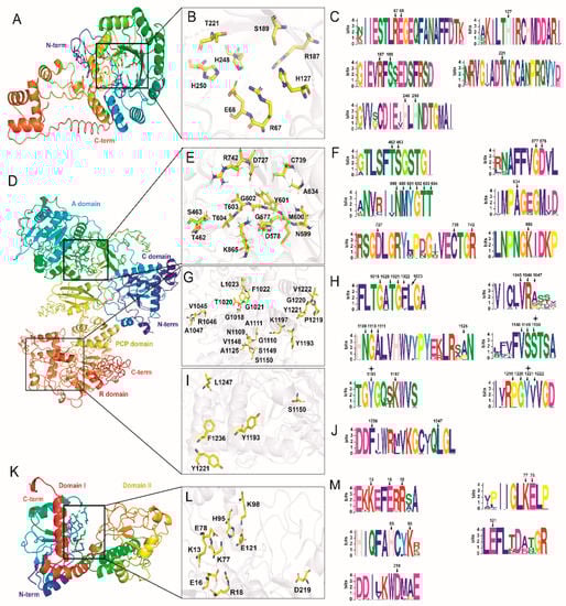 Prediction of 3-D structures and interdomain interactions of substrate molecules trapped in enzymatic progress of HCS, AAR, and SDH. (A) 3-D structure of FvHCS in F. velutipes, (B) interactional binding sites of substrate molecule in HCS, (C) conservative motif of interactional binding sites in homologous sequences of HCS by MEME, (D) 3-D structure of LbAAR in L. bicolor, (E) interactional binding sites of AMP molecule in AAR, (F) conservative motif of interactional binding sites of AMP in homologous sequences of AAR by MEME, (G) interactional binding sites of NAD(P) in AAR, (H) conservative motif of interactional binding sites of NAD(P) in homologous sequences of AAR by MEME, (I) interactional binding sites of putative substrate molecule in AAR, (J) conservative motif of interactional binding sites of putative substrate molecule in homologous sequences of AAR by MEME, (K) 3-D structure of FvSDH in F. velutipes, (L) interactional binding sites of substrate saccharopine in SDH, and (M) conservative motif of interactional binding sites in homologous sequences of SDH by MEME. Abbreviations: “N-term”: N-terminal, the starting site for protein synthesis. “C-term”: C-terminal, the termination site of protein synthesis. “C domain”: Condensation domain in NRPS. “A domain”: Adenylation domain in NRPS. “PCP domain”: Peptidyl carrier protein in NRPS. “R domain”: extended (e) SDRs domain in NRPS. “Domain I”: N-terminal domain in SDH, substrate-bound domains. “Domain II”: C-terminal domain in SDH, NAD bound domain.