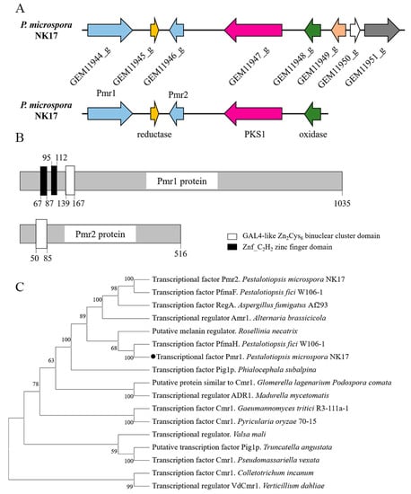Previously, we identified the gene encoding PKS1, which is the core enzyme of melanin synthesis in NK17 [15]. On this basis, we predicted the gene cluster for melanin synthesis where pks1 was located and analyzed the functions of other genes in the cluster by bioinformatics analysis. Additionally, two putative TFs, Pmr1 and Pmr2, were charactered.