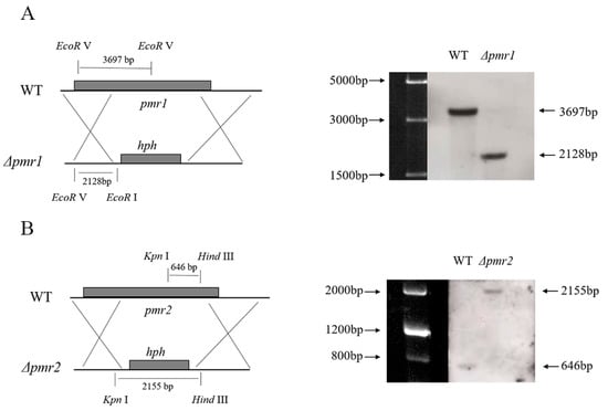 Confirmation of the disruption of pmr1 and pmr2. (A) Southern blotting for verification of the pmr1 deletion. The left panel shows the knock-out strategy for pmr1 via homologous recombination and the restriction enzyme sites used in Southern blot are indicated. Genomic DNAs from NK17 and Δpmr1 were digested with EcoR I and EcoR Ⅴ. One band of 2128 bp on the membrane was obtained for Δpmr1, and one band of 3697 bp was found for WT. (B) Southern blotting for verification of the deletion of pmr2. Genomic DNAs from NK17 and Δpmr2 were digested with Kpn I and Hind Ⅲ. One band of 2155 bp on the membrane was obtained for Δpmr2, and one band of 642 bp was found in WT.
