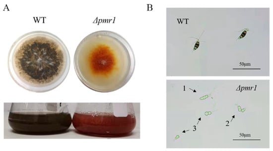 To study the effect of Pmr1 on pigmentation, P. microspora WT and Δpmr1 strains were grown on PLA plates at 28 °C for 7 days, and the colonies appeared orange in Δpmr1 strains in comparison to the black color in WT (Figure 3A). When the mutants were grown in PLB liquid, the same phenotype was observed (Figure 3A). Since previous experiment demonstrated hyphae are colorless in NK17, the color of colonies mainly comes from conidia. Hence, color change in Δpmr1 colony suggested a deficiency of conidial pigmentation.