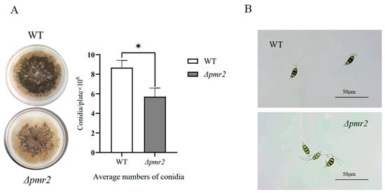 Effects of Pmr2 on melanin synthesis and conidia development. (A) Statistics of the number of conidia produced by WT and Δpmr2. The disruption of pmr2 reduced the production of conidia. Three biological replicates were conducted for both strains. Error bars represent standard deviation. Asterisks indicate differences in mean values significantly (* p < 0.05). (B) Morphology of conidia of Δpmr2. Compared with the WT, the color of the conidia was lighter in Δpmr2 strain.