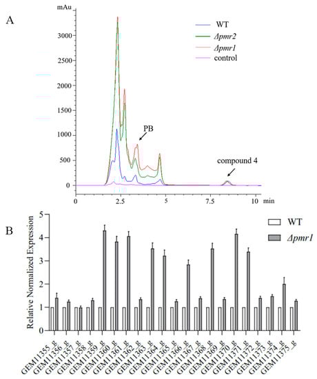 Then, we conducted HPLC profiling for these mutant and wild-type strains. Previous experiments showed that production of secondary metabolites reaches its peak at 8 days, an 8-day culture was used for the extraction of secondary metabolites. HPLC analysis of metabolites revealed that the pestalotiollide B peak at 3.3 min was much greater in the Δpmr1 and Δpmr2 strains than that in the WT; moreover, this increment in Δpmr1 was significantly greater than in Δpmr2. Interestingly, compound 4, a typical compound with unknown structure in P. microspora, was detected at a similar level in both WT and the mutant strains (Figure 5A).