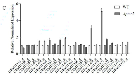 We explored the effect of Pmr1 and Pmr2 on secondary metabolites synthesis. The major secondary metabolites produced by NK17 are dibenzodioxocinins. Among them, pestalotiollide B (PB) is the most rebundant one. Previously we characterized a gene cluster harboring 21 genes (from GEM11355_g to GEM11375_g), responsible for regulating the production of dibenzodioxocinins [21]. In order to probe the influence of Pmr1 and Pmr2 on secondary metabolites synthesis, we measured the expression of genes in the cluster using RT-qPCR in Δpmr1, Δpmr2 and WT strains. RT-qPCR analysis showed that expression of most genes in the cluster was significantly upregulated except GEM11357_g whose expression level was little changed in the mutant strain Δpmr1 (Figure 5B). Similarly, except for GEM11355_g, GEM11364_g and GEM11367_g, other genes responsible for the synthesis of dibenzodioxocinins were upregulated due to the deletion of pmr2 (Figure 5C).