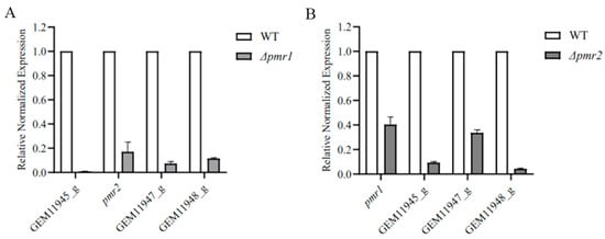 As presented above, we identified five genes in the gene cluster for melanin synthesis, which encode a polyketide synthase, a putative multicopper oxidase, a putative 3-oxoacyl-(acyl-carrier-protein) reductase and two transcription factors, Pmr1 and Pmr2. To investigate the potential regulatory roles of Pmr1 and Pmr2 on the other genes in the cluster, we determined the expression of these genes using RT-qPCR. The results showed that Pmr1 or Pmr2 deletion downregulated the expression of the genes in melanin biosynthesis cluster, and the regulatory action of Pmr1 appeared significantly greater than the action of Pmr2 (Figure 6).