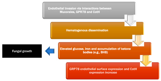 Several clinically relevant observations on the interplay of these receptors are reported in the literature. Acidosis caused by -hydroxybutyrate (BHB) (a ketone body representative) and higher blood iron levels were the primary variables that increased expression of GRP78 and CotH, but lactic acidosis had no effect on their expression. Furthermore, sodium bicarbonate changed the effect and protected BHB–treated mice from mucormycosis, suggesting the importance of managing acidosis as a therapeutic strategy in diabetic ketoacidosis and mucormycosis [52]. Another study found that either anti-GRP78 or anti-CotH antibodies entirely prevented R. oryzae endothelium invasion [53]. This activity, however, suggests the presence of other components implicated in the interaction between endothelial cells and fungus [53]. The development of secondary fungal compounds that function as toxins is another potential cause of endothelium injury [44].