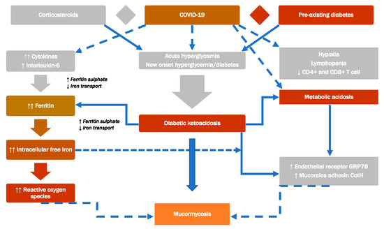 Mucorales may enter the body via contaminated food ingestion, inhalation, or abraded skin regions. It can induce infections in the ROCM, pulmonary, GI, or cutaneous/wound systems. Mucorales have various characteristics (innate thermotolerance, ability to attach endothelial cell membrane, rapid growth, ability to obtain iron from the host organism, downregulation of host–defense genes associated to pathogen recognition, immune response, and tissue healing), all of which contribute to the disease’s aggressive nature [39,40]. Inhibition of interferon expression [41], as well as an evolutionary duplication of a mechanism involved in energy consumption and pathogenicity, were discovered in a whole-genome string of R. oryzae [42]. Mucormycosis predisposing factors ketoacidosis and deferoxamine highlight the role of hyperglycemia, iron, and acidifying ketone bodies in Mucorales pathogenicity (Figure 1).