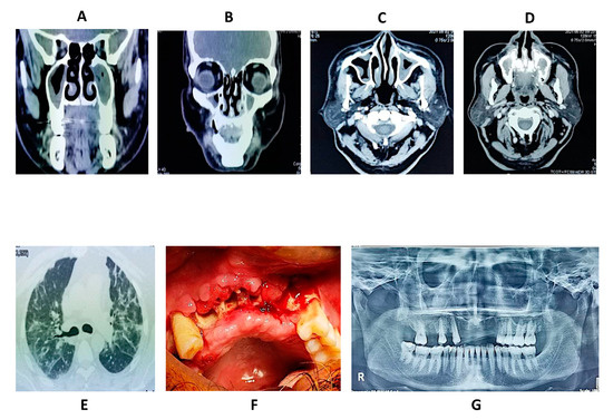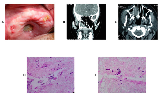 - Mignogna, M.D.; Fortuna, G.; Leuci, S.; Adamo, D.; Ruoppo, E.; Siano, M.; Mariani, U. Mucormycosis in immunocompetent patients: A case-series of patients with maxillary sinus involvement and a critical review of the literature. Int. J. Infect. Dis. 2011, 15, e533–e540. [Google Scholar] [CrossRef]