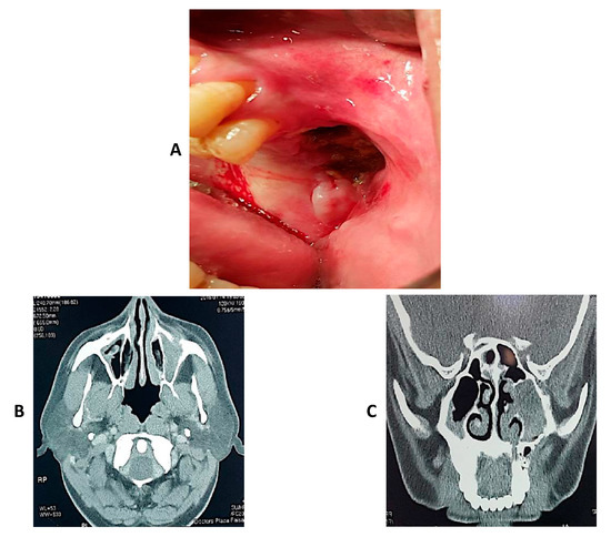 Picture A, showing exposed necrotic bone in the left posterior maxilla (A). The axial (B) and coronal (C) slices of contrast enhanced CT scan showing bone destruction, sequestrum formation, sinus opacification, and involvement of the nasal turbinates.