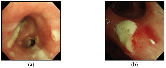 Twenty (83.3%) patients had a serum GM index >0.5. Of 19 patients undergoing bronchoscopy, 15 (78.9%) patients had a serum GM index >0.5 and 14 (73.7%) had a BALF GM index ≥1.0, which included all four patients with a serum GM index <0.5. Therefore, all 24 patients with IAPA had either a serum GM index >0.5 or a BALF GM index ≥1.0. Via bronchoscopy, ATB presenting as tracheobronchial ulceration, pseudomembrane, or whitish plaque was noted in six patients (31.6%) (Figure 1), and in whom their BALF GM index was ≥1.0. The BALF GM index in the six patients with ATB was higher than that in the thirteen patients without ATB, though the difference was not significant (4.3 vs. 3.0, p = 0.17).