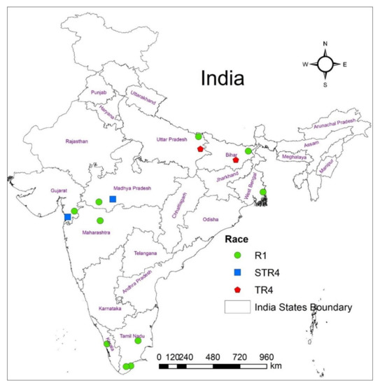 After race typing, isolates were rearranged and assessed based on their geographic state of origin. For this, the races of respective isolates were identified and all the states were combined. Out of 61 samples subjected, a maximum of 68.9% are R1 (44) followed by 31.1% are R4 (19), in which 6.6% are STR4 (4) and 24.6% are TR4 (15). Of the eight states surveyed, Foc R1 has been the dominant race present in all the states of India (Figure 1). However, the Foc TR4 and STR4 are identified in two states where Foc TR4 was distributed in Uttar Pradesh and Bihar while Foc STR4 was identified from Gujarat and Madhya Pradesh. The locations and samples were randomly selected during our survey. Foc isolates differed in percentages from previously reported studies in which race 1 had been the most common race, instead of other races used in this study [33]. The markers used in this present study should enhance the speed and accuracy of the existing diagnostic ability for Foc and provide a jumping-off point to investigate similar regions involved in pathogenicity and race development for various researchers. This study exploited the variation within the whole-genome sequences of Foc races for developing Foc races (R1, R4, TR4, and ST4) specific markers.