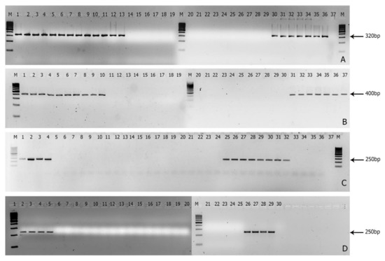 Development of molecular markers for the specific detection of Foc races; (A): amplicons of FocR1F/FocR1R primer set for Foc R1; (B): amplicons of FocR4F/FocR4R primer set for Foc R4; (C): amplicons of FocTR4F/FocTR4R primer set for Foc TR4; and (D): amplicons of FocSTR4F/FocSTR4R primer set for Foc STR4. For A: M: Marker; Lane 1–13: Foc R1 VCGs; Lane 14–20: Foc VCGs of TR4 and STR4 (VCG 01213, 01216, 01213/16, 0120, 0121, 0129, and 01211); Lane 21: Pseudocercospora eumusae; Lane 22: Colletotrichum musae; Lane 23: Klebsiella variicola; Lane 24–28: Nonpathogenic Fusarium oxysporum (npFo) isolates; Lane 29: Fusarium solani; and Lane 30–36; Foc VCGs of Race 1 (VCGs 0124, 01220, 0125, 0124/5, 0123, 0126 and 01210; and Lane 37; no template control. For B: M: Marker; Lane 1–10: Foc race 4 isolates (both TR4 and STR4); Lane 11–17: Foc VCGs of R1 (VCG0124, 01220, 0125, 0124/5, 0123, 0126 and 01210); Lane 18–22: npFo isolates; Lane 23: Pseudocercospora eumusae; Lane 24: Colletotrichum musae; Lane 25: Klebsiella varicola; Lane 26: Fusarium solani; Lane 27–30: no template control; Lane 31–37: Foc R4 VCGs (01213, 01216, 01213/16, 0120, 0121, 0129 and 01211); For C: M: Marker; Lane 1–4: Foc VCG 01213, 01216, 01213 and 01213/16; Lane 5–12: Foc R1 and STR4 VCGs (VCG 0124, 01220, 0125, 0124/5, 0123, 0126 and 01210 and 0120); Lane 13–17: npFo isolates; Lane 18: F. solani; Lane 19: Pseudocercospora eumusae; Lane 20: Colletotrichum musae; Lane 21: Klebsiella variicola; Lane 22 and 23 npFo isolates Lane 24–32; Foc TR4 isolates; Lane 33–36: Foc isolates of R1 and STR4; and Lane 37: no template control. For D: Lane 1: Marker; Lane 2–5: Foc STR4 isolates; Lane 6–16: Foc VCGs of TR4 and R1 (VCG01213, 01216, 01213/16, 0124, 01220, 0125, 0124/5, 0123, 0126, 01210 and 0128); Lane 17–20; npFo isolates; Lane 21: Fusarium solani; Lane 22: Pseudocercospora eumusae; Lane 23: Colletotrichum musae; Lane 24: Klebsiella varicola; Lane 25–28: Foc VCGs of STR4 (0120, 0121, 0129 and 01211); and Lane 29–30: no template control.