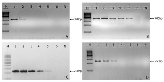 Sensitivity of the primer sets FocR1F/FocR1R (A), FocR4F/FocR4R (B), FocTR4F/FocTR4R (C), and FocSTR4F/FocSTR4R (D). A serial dilution of genomic DNA ranging from 200 ng to 0.02 pg µL−1 was used; where 1: 200 ng; 2: 100 ng; 3: 10 ng; 4: 1 ng; 5: 10 pg; and 6: 1 pg. Lanes M—100 bp Marker; N—Negative control.