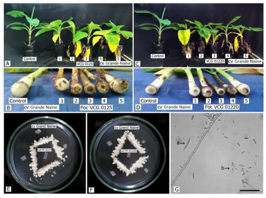Banana cv. Grande Naine 25–30 days after inoculation with different races of Foc isolates. (A,C): Pathogenicity test of VCG0125 and VCG01220; (B,D): Cross-section of rhizome for vascular discoloration; (E,F): isolation and confirmation of VCGs by nit-M testers; and (G): Spore morphology of 7 days old culture of Foc VCG 0125 where a: macroconidia and b: microconidia, the scale bar is 100 µm and the image taken under 40× magnification on the Nikon® light microscope Eclipse TE2000.