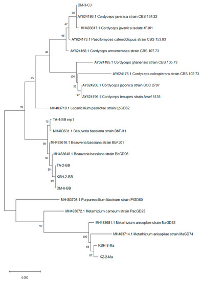 - Ou, D.; Zhang, L.H.; Guo, C.F.; Chen, X.S.; Ali, S.; Qiu, B.L. Identification of a New Cordyceps javanica Fungus Isolate and Its Toxicity Evaluation against Asian Citrus Psyllid. Microbiologyopen 2019, 8, e00760. [Google Scholar] [CrossRef] [PubMed]