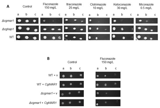 Therefore, the role of the TFs CgHAP1 and CAGL0B03421g in azole stress tolerance was investigated. The deletion of CAGL0B03421g increases C. glabrata susceptibility to fluconazole, clotrimazole, ketoconazole, and miconazole and more subtly to itraconazole, when compared with the wild-type, whereas no sensitization effect was observed upon CgHAP1 deletion (Figure 1A). The MIC (Minimum Inhibitory Concentration) values for fluconazole were also determined, revealing a two-fold susceptibility increase upon deletion of CAGL0B03421g, while no difference was observed for the Δcghap1 strain (Table 2). Accordingly, the expression of CAGL0B03421g rescues the mutant susceptibility phenotype, and its overexpression in wild-type cells leads to a slight decrease in susceptibility (Figure 1B). The results indicate a role for CAGL0B03421g (but not CgHAP1—CAGL0K05841g) in azole susceptibility phenotype. Since CAGL0B03421g is the syntenic HAP1 ortholog but the designation of C. glabrata Hap1 is already attributed to CAGL0K05841g (the second HAP1 homolog) and considering that ScHap1 is not known to participate in azole response, the gene CAGL0B03421g is henceforth designated CgMAR1 (Multiple Azole Resistance 1).