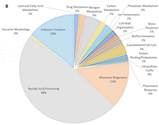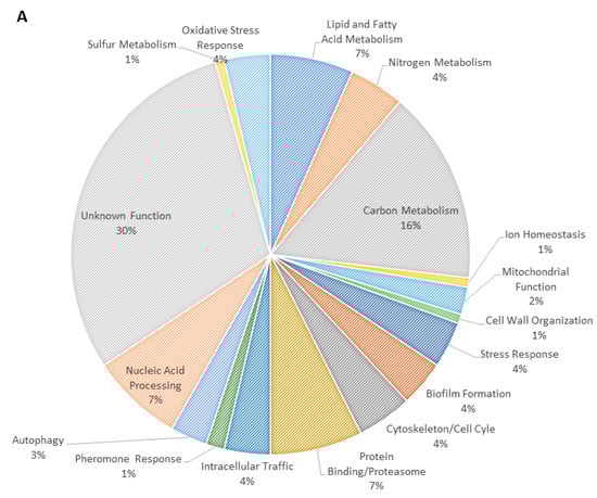 To investigate the role of CgMar1 in fluconazole response, global gene expression changes in ∆cgmar1 cells were assessed through RNA-sequencing and compared with those of wild-type cells. In control conditions, the deletion of CgMAR1 results in the altered expression of 525 genes: 222 genes show decreased expression, while 303 genes show increased expression in Δcgmar1 cells when compared with wild-type cells (Table S2). Interestingly, adhesin genes are among those with more prominent expression changes upon CgMAR1 deletion; however, no changes in biofilm formation were observed for the Δcgmar1 strain, when compared with the parental wild-type strain, in RPMI medium (Figure S2). Upon fluconazole exposure, the Δcgmar1 cells presented differential expression of 337 genes: 203 genes showed increased expression and 134 genes showed decreased expression when compared with wild-type cells (Table S3). Among those, 30% were exclusively regulated during antifungal stress and not in control conditions. The most prevalent functional groups of genes putatively activated by CgMar1 (reduced expression in the Δcgmar1 mutant) during fluconazole stress comprise carbon, nitrogen, and lipid metabolism (Figure 2A), while genes negatively regulated are especially enriched in nucleic acid processing and ribosome biogenesis genes (Figure 2B). Since the antifungal activity of fluconazole leads to defective plasma membrane properties [8,9], the differential regulation of lipid metabolism pathways by CgMar1 is particularly interesting. CgMar1-regulated genes do not include ergosterol biosynthesis but rather sterol transfer genes: CgLAM1, CgLAM5, and CgLAM6. Genes related to sphingolipid (CgRSB1 and CgYPC1) and phospholipid (CgOPI10 and CgNTE1) metabolism as well as the metabolism of carnitine (CgYAT2) and fatty acids (CgHBN1) are activated by CgMar1.