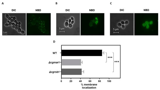 Therefore, we assessed the subcellular localization of fluorescently labeled dihydrosphingosine (NBD-DHS) in wild-type and ∆cgrsb1 cells. Wild-type cells incorporate DHS in the cell periphery with a dotted pattern, consistent with a lipid raft distribution in the membrane (Figure 3A). Contrarily, the ∆cgrsb1 mutant incorporates less NBD-DHS in the plasma membrane and more inside the cells (Figure 3B). The subcellular localization of NBD-DHS was also assessed in ∆cgmar1 cells, which failed to incorporate NBD-DHS at the plasma membrane (Figure 3C). The quantification of NBD-DHS localization to cell membranes in each population supports these data: wild-type cells were seen to incorporate DHS efficiently (85.3%), while the mutant strains ∆cgmar1 or ∆cgrsb1 were seen to incorporate only 41.3% or 42.6% DHS in the cell membrane, respectively, which represents a two-fold decrease in membrane DHS incorporation (Figure 3D). The evidence suggests that CgRsb1 and its regulator CgMar1 contribute to the incorporation of DHS in the plasma membrane, therefore being involved in plasma membrane organization.