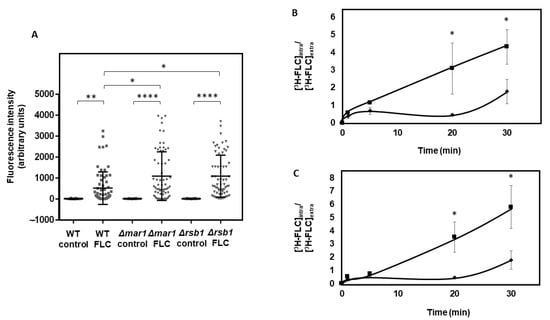 3H-fluconazole transport assays were carried out as described before for other radiolabeled compounds [29,30,31,38]. The internal accumulation of fluconazole was determined by calculating the ratio between the radiolabeled fluconazole measured within the yeast cells and in the external medium (intracellular/extracellular). The parental strain KUE100 and the mutant strains KUE100_Δcgmar1 and KUE100_Δcgrsb1 were grown in BM until the mid-exponential phase and harvested by filtration. The cells were washed and resuspended in fresh BM to obtain dense cell suspensions (OD600nm = 0.5 ± 0.1, equivalent to approximately 1.57 mg (dry weight) mL−1). Readily, 0.1 µM of 3H-fluconazole (Moravek Inc., Brea, CA, USA; 1 mCi/mL) and 150 mg/L of unlabeled fluconazole were added to the cell suspensions. Incubation proceeded for an additional period of 30 min. The intracellular accumulation of labeled fluconazole was followed by filtering 200 µL of cell suspension at adequate time intervals through pre-wetted glass microfiber filters (Whatman GF/C, Merck, Darmstadt, Germany). The filters were washed with ice-cold TM buffer, and the radioactivity was measured in a Beckman LS 5000TD scintillation counter. Extracellular 3H-fluconazole was estimated by radioactivity assessment of 50 µL of the supernatant. Non-specific 3H-fluconazole adsorption to the filters and to the cells (less than 5% of the total radioactivity) was assessed and taken into consideration. To calculate the intracellular concentration of labeled fluconazole, the internal cell volume (Vi) of the exponential cells, grown in the absence of drug and used for accumulation assays, was considered constant and equal to 2.5 µL (mg dry weight)−1 [39].