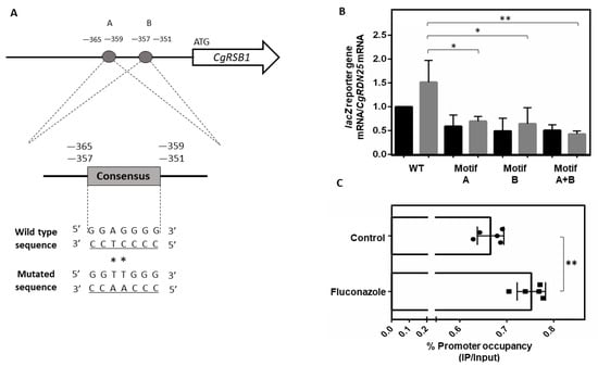 The CgRSB1 promoter was placed upstream of the lacZ reporter gene and site-directed mutagenesis was used to disrupt each replicate of the CCCCTCC consensus (designated Motif A or Motif B, for simplicity) (Figure 5A). Upon 1 h of fluconazole exposure, lacZ expression increased by 1.5-fold, which is in accordance with the transcriptomics data (Figure 5B). When either Motif A or Motif B was disrupted, lacZ expression from the mutated promoter in control conditions did not significantly change when compared with the wild-type promoter; however, under fluconazole stress, lacZ expression from the mutated promoter was reduced by two-fold compared with the wild-type promoter (Figure 5B). Additionally, when both motifs were concurrently disrupted, a more significant reduction of lacZ expression (three-fold) relative to the wild-type promoter is observed during fluconazole stress (Figure 5B). These results indicate that the two CCCCTCC motifs are required for the activation of CgRSB1 expression, especially in response to fluconazole.