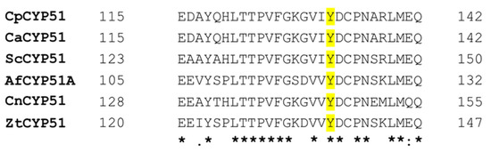 Primary sequence alignment of several fungal pathogens in the region of Y132 CpCYP51 using ClustalW. C. albicans CYP51 (CaCYP51), S. cerevisiae CYP51 (ScCYP51), A. fumigatus CYP51A (AfCYP51A), C. neoformans CYP51 (CnCYP51) and Z. tritici CYP51 (ZtCYP51). The tyrosine residue (Y), equivalent to Y132 in CpCYP51, is highlighted in yellow. An asterisk denotes conserved residues, a colon indicates conservative substitutions and a full stop marks semi-conservative substitutions.