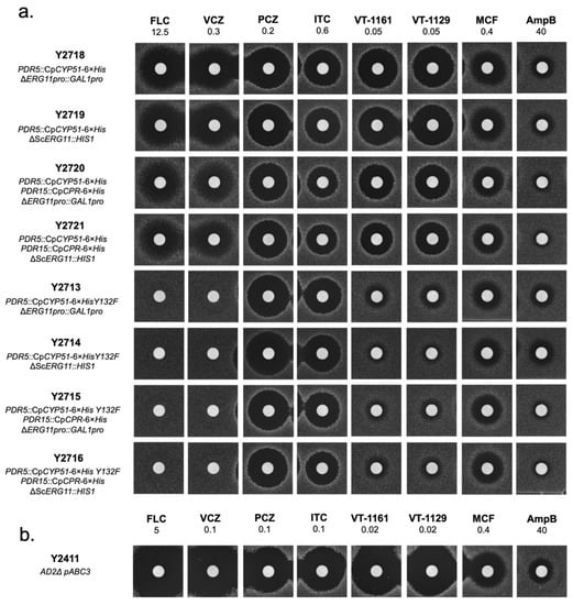 Agarose diffusion drug susceptibility analysis of host and recombinant strains to azole and control drugs. (a) Susceptibilities to antifungals of strains expressing recombinant CpCYP51 and CpCYP51 Y132F from the PDR5 loci co-expressed with CpCPR from the PDR15 loci. (b) Susceptibilities to the antifungals of the reference strain Y2411. The indicated amount of antifungal loaded is in nanomole per disk.