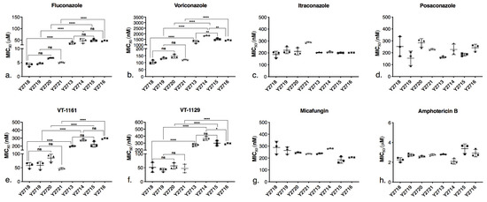 In contrast, the susceptibility patterns of the strains expressing CpCYP51 or CpCYP51 Y132F for the long-tailed triazoles ITC and PCZ were not significantly affected by the Y132F mutation or co-expression of CpCPR or (Figure 4c,d). The MIC80 values of the CpCYP51 and CpCYP51 Y132F overexpressing strains for ITC and PCZ were in the range of 150–300 nM and were thus comparable to Y2411 (Table S3). The susceptibilities of strains Y2713–Y2716, which overexpress CpCYP51 Y132F, to the tetrazoles VT-1161 and VT-1129 were intermediate between those of the short- and long-tailed azoles, i.e., the mutant enzyme conferred up to an eight-fold reduction in susceptibility to these azoles. The CpCYP51 Y132F strains (Y2713–Y2716) were three- to eight-fold less susceptible to VT-1161 (Figure 4e) and VT-1129 (Figure 4f) than the CpCYP51 strains (Y2713–Y2716). As expected, all recombinant strains expressing CpCYP51 or CpCYP51 Y132F and strain Y2411 showed comparable susceptibilities to the control drug MCF (Figure 4g and Table S3). Comparable susceptibility to AmpB suggests that the expression of the constructs did not alter significantly the ergosterol content in the recombinant strains compared to the control strain Y2411 (Figure 4h and Table S3).