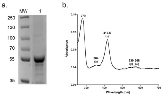 Analysis of SEC-purified CpCYP51-6×His. (a) Coomassie-stained SDS-PAGE profile of purified wild type CpCYP51-6×His (~59.5 kDa). MW: 5 µL protein molecular weight markers (PageRuler Plus pre-stained protein ladder, Thermo Scientific). (b) Absolute absorbance spectrum of the SEC-purified CpCYP51-6×His.