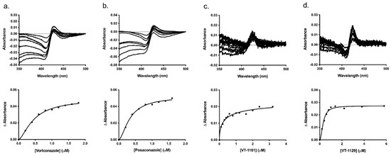 Typical type II binding spectra were obtained on titration of Ni-NTA-purified CpCYP51-6×His (1 μM) with VCZ, PCZ, VT-1161 and VT-1129. The difference in absorbance (∆Amax) was almost two-fold less on binding to the tetrazoles VT-1161 and VT-1129 compared to that of the triazoles VCZ and PCZ, with peaks shifted from 429–427 nm for triazole binding to 423–425 nm for tetrazole binding and the troughs shifted from 411–407 nm for triazole binding to 411–405 nm for tetrazole binding (Figure 6 and Table 2). The broad troughs show that the enzyme’s heme iron was completely in the low spin state before exposure to the inhibitors [50]. The narrower trough for the binding of VT-1129 compared with VT-1161 indicated significant differences in the electronic configurations of the heme on the binding of these closely structurally related tetrazoles. The corresponding saturation curves were plotted by fitting in to the Hill equation (Figure 6), and the binding parameters (Kd and Hill coefficient) are tabulated in Table 2. Dissociation constant (Kd) values significantly lower than the enzyme concentration showed that all the drugs bound tightly to the enzyme [66].