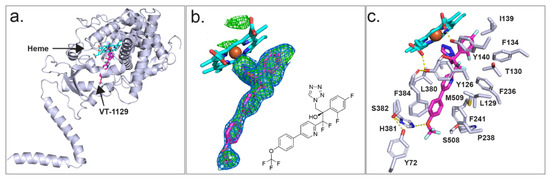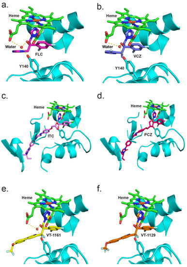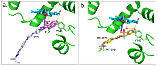 Figure 9b shows a comparison between the crystal structures of ScCYP51 in complex with VT-1161 and VT-1129. Both drugs bind to CYP51 in a similar fashion. VT-1161 interacts with the heme iron through the tetrazole N3 atom and, similar to short-tailed azoles, the tertiary hydroxyl group of VT-1161 forms a water-mediated hydrogen bond network with the residue Y140 which also forms a hydrogen bond with the heme RCC. The crystal structure of the CaCYP51 catalytic domain also forms a similar network with VT-1161 (PDB ID: 5TZ1) [41]. Disruption of this by Y140F/Y132F mutations results in reduced susceptibility to VT-1161 in ScCYP51/CaCYP51. Therefore, the resistance to VT-1161 conferred by the expression in yeast of recombinant CpCYP51 Y132F can be considered to be equivalent to that conferred by overexpression of recombinant ScCYP51 Y140F in yeast. The ScCYP51 structure in complex with VT-1129 lacked the water-mediated hydrogen bond network involving the VT-1129 tertiary alcohol and Y140, but its presence cannot be excluded.