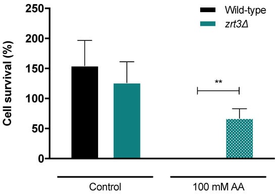 Cell survival of wild-type and zrt3Δ cells after AA treatment. Cell survival was assessed by c.f.u. 120 min after treatment with 100 mM AA, pH 3.0. Values are mean ± SEM (n ≥ 3). Statistical analysis was performed by two-way ANOVA. ** p < 0.01 in comparison with the wild-type strain.