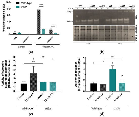 To address whether the AA resistance phenotype of zrt3Δ was associated with lower mitochondrial ROS accumulation, cellular and mitochondrial superoxide anion accumulation was measured by flow cytometry after staining with DHE and Mitosox, respectively. Both cellular and mitochondrial superoxide anion accumulation in response to AA decreased significantly in the zrt3Δ mutant, as only less than 20% and 5% of the cells were stained with DHE and Mitosox, respectively. In contrast, the wild-type strain exhibited around 80% and 15% of DHE- and Mitosox-positive cells, respectively, (Figure 2a). Therefore, the next step was to evaluate how the activities of superoxide dismutases and catalases are affected by ZRT3 deletion, which is associated with increased cellular zinc levels [36]. zrt3Δ cells displayed a significantly higher basal activity of catalases than wild-type cells (Figure 2d), while Sod1 activity was not significantly different (Figure 2b,c). Moreover, AA did not affect the activity of catalases in the wild-type strain, but significantly decreased the enhanced basal activity of catalases in zrt3Δ cells (Figure 2d). On the other hand, treatment with AA increased the Sod1 activity of the wild-type strain, though this was not statistically significant, while it had no effect in zrt3Δ cells (Figure 2c).