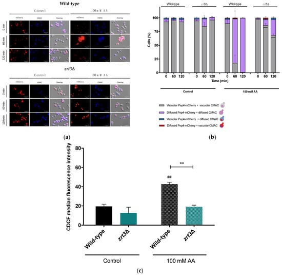 The effect of AA on Pep4-mCherry translocation from the vacuole into the cytosol, vacuolar membrane permeabilization and vacuolar pH in S. cerevisiae wild-type and zrt3Δ strains treated with AA. (a) Representative fluorescence microscopy images of wild-type and zrt3Δ cells transformed with Pep4-mCherry. Cells were incubated up to 120 min with or without AA and then stained with 2 µM CMAC to assess vacuole membrane integrity. Cells were observed under the fluorescence microscope with a 100× oil immersion objective. (b) Quantification of Pep4-mCherry localization and cells displaying VMP. At least 300 cells were counted for each condition. Values are the mean ± SEM (n = 3). Statistical analysis was performed by two-way ANOVA. **** p < 0.0001 in comparison with AA-treated wild-type cells. (c) Quantification of CDCF median fluorescence intensity of S. cerevisiae BY4741 wild-type and zrt3Δ cells 60 min after AA treatment (100 mM), pH 3.0. Cells were stained with 1.6 µM CDCFDA and analyzed by flow cytometry. Values are the median ± SEM (n = 3). Statistical analysis was performed by two-way ANOVA. ## p < 0.01 in comparison with the control of wild-type cells; ** p < 0.01 in comparison with the AA-treated wild-type strain.