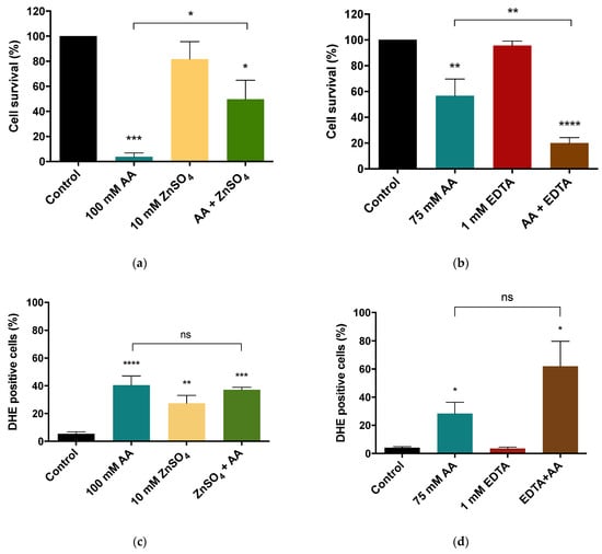 Effect of zinc supplementation (a) or limitation (b) on AA-induced cell death and cellular superoxide anion accumulation (c,d) in S. cerevisiae BY4741 wild-type cells. (a) Cells were treated with 10 mM ZnSO4, 100 mM AA or co-treated with both for 60 min. (b) Cells were pre-treated with and without 1 mM EDTA for 30 min and next treated with 1 mM of EDTA, 75 mM of AA or co-treated with both for 90 min. Cell survival was assessed by c.f.u. counting. (c) Quantification of the percentage of DHE-positive stained cells after supplementation with 10 mM ZnSO4, 100 mM AA or both for 60 min. (d) Quantification of the percentage of cells with DHE-positive staining after pre-treatment with and without 1 mM EDTA for 30 min, followed by treatment with 1 mM of EDTA, 75 mM of AA or both for 90 min. Values are percentages of DHE-positive cells ± SEM of three (a,b), five (c) and three (d) independent experiments. Statistical analysis was performed by one-way ANOVA. * p < 0.05, ** p < 0.01, *** p < 0.001, **** p ˂ 0.0001 in comparison with the control, or between indicated conditions. Non-significant values are represented as ns.