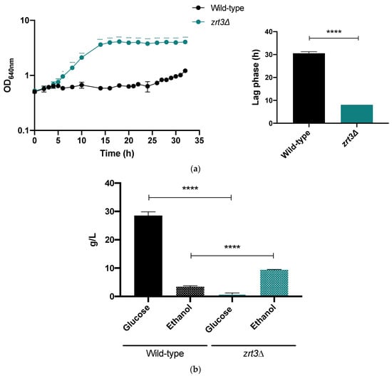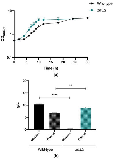 As reported in Materials and Methods, the lignocellulose biomass used was vine prune residue subjected to autohydrolysis. This pre-treatment resulted in the accumulation of AA (21 mM), formic acid (19 mM), furfural (2 mM) and 5-HMF (2.4 mM). To avoid nutrient limitation, the LH was supplemented with YEPD medium components. Although the OD at stationary phase was identical for both strains 30 h after the inoculation (Figure 6a), the fermentative performance of zrt3Δ was better than that of the wild-type strain. Indeed, the lag phase was 5 and 7 h; µmax, 0.24 and 0.19 h−1 for the zrt3Δ strain and wild-type strain, respectively. Importantly, at the end of the exponential phase (12 h), the zrt3Δ mutant produced a higher ethanol concentration (Figure 6b).