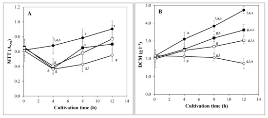 Growing and metabolic activity of the studied A. nidulans THS30 cultures. Changes in the MTT-reducing activity (A) and DCM (B) of the strain were characterized in cultures growing on glucose (●), in the absence of any carbon source (○), on lactose (■), or on arabinogalactan (□). Mean ± SD values calculated from three biological replicates are presented. The MTT-reducing activity of 12 h cultures was significantly higher (Student’s t-test, p < 0.05) than that of the 4 h cultures. The DCM of the 12 h glucose, lactose, or arabinogalactan-containing cultures was significantly higher (Student’s t-test, p < 0.05) than that of the 0 h cultures. g, l, a, s—Significant difference (Student’s t-test, p < 0.05) from the data of cultures containing glucose, lactose, arabinogalactan, or no carbon source, respectively.
