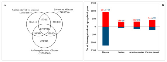 Carbon-starvation and carbon-limitation stresses changed the expression of many genes (Figure 2A). Earlier studies demonstrated that there is a substantial overlap among the early stress responses of carbon-limited and carbon-starved cultures [24]. This has been explained by the near-starvation of carbon-limited cultures until utilization of the alternative carbon sources is established [24]. Therefore, we took samples at times when utilization of lactose and arabinogalactan had already started according to their growth pattern (Figure 1). Nevertheless, we found substantial overlap among the genome-wide transcriptional changes of the three carbon-stressed cultures: 39% of the carbon-stress-responsive genes showed upregulation in all three carbon-stressed cultures, and 38% showed downregulation (Figure 2A). By definition, these same genes showed culture-specific downregulation and upregulation, respectively, in glucose-rich cultures. They also highly exceeded the number of culture-specific down- and upregulated genes in carbon-stressed cultures (Figure 2B).
