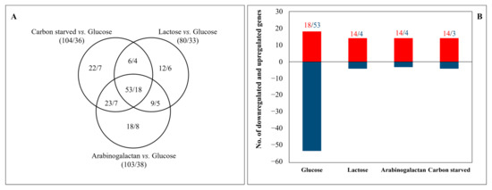 Distribution of carbon-stress-responsive (A) and culture-specific (B) genes among the cultures. Figures represent the number of upregulated/downregulated genes. Note, the three sets in (A) contain carbon-stress-responsive genes, and the intersection of the three sets contains the general stress response genes (using glucose-containing cultures as reference). The upregulated general stress response genes are identical with the downregulated glucose-specific genes and the downregulated general stress response genes are identical with the upregulated glucose-specific genes (B).