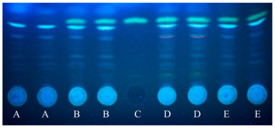 Production of sterigmatocystin by carbon-stressed A. nidulans THS30 cultures. A representative photo on the results of a TLC is presented. Mycelial samples were taken 12 h (carbon-stressed cultures) or 4 h (glucose-containing cultures) after the mycelia, grown on glucose, were transferred into fresh media. A—glucose-containing cultures; B—carbon-starved cultures; C—sterigmatocystin standard; D—lactose-containing cultures; E—arabinogalactan-containing cultures.