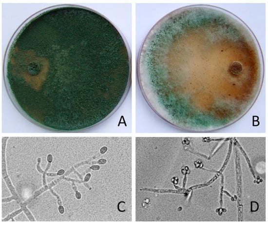 Macromorphology and micromorphology of Trichoderma strains on MEA after 7 days. (A)—T. ghanense colony and (C)—conidiophores and conidia. (B)—T. tomentosum colony and (D)—conidiophores and conidia. Magnification × 400.