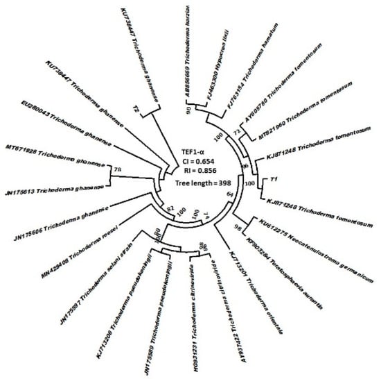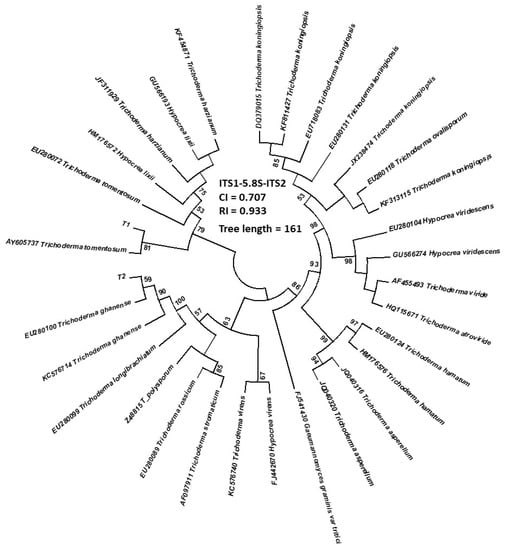 Phylogeny of Trichoderma isolates based on ITS1-5,8S-ITS2 and TEF1 loci. The most parsimonious tree for each locus with appropriate length is shown. CI—consistency index, RI—retention index. The percentage >50% of replicate tree is shown next to branches.
