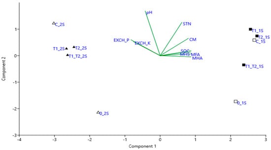 PCA diagrams for variables in experiment on Trichoderma spp. inoculated soil originated from different land-use systems. 0_1S—original grassland, C_1S—grassland non-inoculated, T1_1S—grassland inoculated with T. tomentosum, T2_1S—grassland inoculated with T. ghanense, T1_T2_1S—inoculated with the complex T. tomentosum + T. ghanense, 0_2S—original arable soil, C_2S—arable soil non-inoculated, T1_2S—arable soil inoculated with T. tomentosum, T2_2S—arable soil inoculated with T. ghanense, T1_T2_2S—inoculated with the complex T. tomentosum + T. ghanense. SOC—soil organic carbon, MHA—mobile humic acid, MFA—mobile fulvic acid, MHS—mobile humic substances, CM—CM-cellulase activity of soil, STN—total N, pH—soil pH, EXCH_K—exchangeable K2O, EXCH_P—exchangeable P2O5.