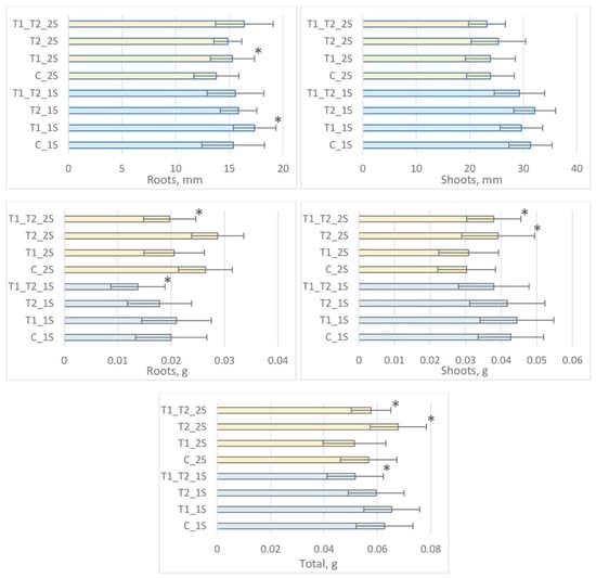 Effects of inoculation with Trichoderma spp. on vegetative plant growth. C_1S—grassland non-inoculated, T1_1S—grassland inoculated with T. tomentosum, T2_1S—grassland inoculated with T. ghanense, T1_T2_1S—grassland inoculated with the complex T. tomentosum + T. ghanense, C_2S—arable soil non-inoculated, T1_2S—arable soil inoculated with T. tomentosum, T2_2S—arable soil inoculated with T. ghanense, T1_T2_2S—arable soil inoculated with the complex T. tomentosum + T. ghanense. * above the bars indicate significant differences.
