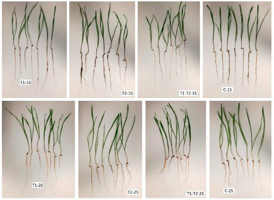 The early seedlings of rye after harvest. T1-1S—grassland inoculated with T. tomentosum, T2-1S—grassland inoculated with T. ghanense, T1-T2-1S—grassland inoculated with the complex T. tomentosum + T. ghanense, C-1S—grassland non-inoculated, T1-2S—arable soil inoculated with T. tomentosum, T2-2S—arable soil inoculated with T. ghanense, T1-T2-2S—arable soil inoculated with the complex T. tomentosum + T. ghanense, C-2S—arable soil non-inoculated.
