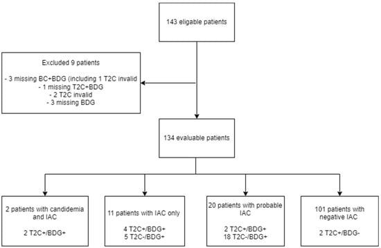 Flowchart of patient inclusion. Abbreviations: T2C, T2Candida magnetic resonance assay; BDG, 1,3-β-D-glucan; IAC, intraabdominal candidiasis.
