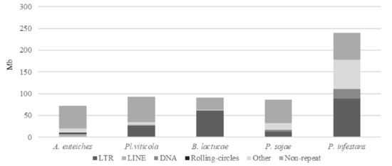 We identified that close to 25% of the whole genome sequence of A. euteiches was represented as repeated sequences (Table S1c). This high level of repetition was not detected in our previous study where we used an Illumina/454 assembly [41]. As depicted in Figure 2, the most abundant repeat types were the LINEs repeats, which accounted for 3.7 Mb, and the LTR elements, which accounted for 2 Mb. To compare the levels of the different repeats in A. euteiches with those in other oomycetes, we selected three plant pathogenic oomycete genomes sequenced with long-read technology (Plasmopara viticola [58], Bremia lactucae [59], Phytophthora sojae [60]) and also included the Phytophthora infestans genome sequence [21]. When compared with the other oomycetes, the proportions of the different repeat types differed in A. euteiches, with it having the smallest size of repeated sequence and the largest portion of LINEs. Using the rolling-circles mechanism, we found that 1.5 Mb of the repeated sequences were predicted to be replicated. This has not been detected in other oomycetes (Figure 2, Table S1d).