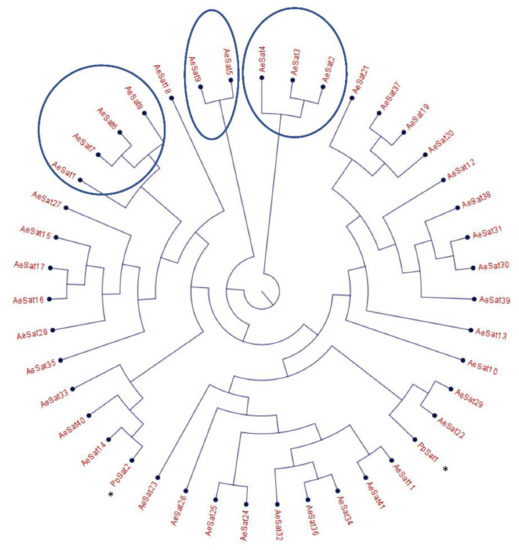 The large proportion of repeated regions in the A. euteiches genome prompted us to look for putative tandemly repeated sequences varying in size, copy number and sequence conservation, which could correspond to putative satellite DNA. The latter was recently reported following genome resequencing by long-read technology of the oomycete Phytophthora parasitica [37]. Based on the report by Panabières et al. [37], we searched for tandemly repeated sequences with monomer sizes ranging from 100 to 500 bp. The monomeric sequences were used to perform BlastN searches against the A. euteiches genome to identify the number of occurrences in the genome; the ones with more than 100 occurrences were kept for further analysis. We used blastclust pairwise comparison to group the tandem repeats into clusters based on sequence similarity. Our analysis revealed 41 families (AeSat) of tandem repeats matching satellite DNA criteria (Table S1e). As previously described for Phytophthora, the GC content might vary significantly between satellite DNA families, from 39% to 63% for the A. euteiches genome. The number of copies varied from 106 to more than 3000 for the four most-represented AeSat (i.e., AeSat1–AeSat4). In these regions, no coding sequences were identified, but for ten AeSat, we identified similarities with known transposable elements (TE), such as DNA/Harbinger, DNA/Helitron, NonLTR/Tad1, LTR/Gypsy and IntegratedVirus/DNAV (Table S1e). Sequence homologs of the two abundant families PpSat1 and PpSat2 from P. parasitica [37] were identified in A. euteiches. To unravel the relationship among satellite DNA families, a phylogenetic tree was constructed including PpSat1 and PpSat2 from P. parasitica [37] (Figure 3). The topology of the tree suggests diversification in AeSat families, with high copy number (i.e., >1000) families clustered into a central location group.